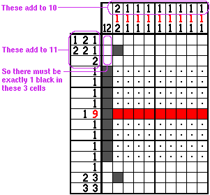So, since the row clues tell us there must be 11 cells filled in, in the top, and since we know there are 10 in columns 2 through 10, there must be exactly one black cell in the first three rows of column 1. That tells us exactly where the 12 in column 1 must be, and the rest of the puzzle is trivial to solve.
